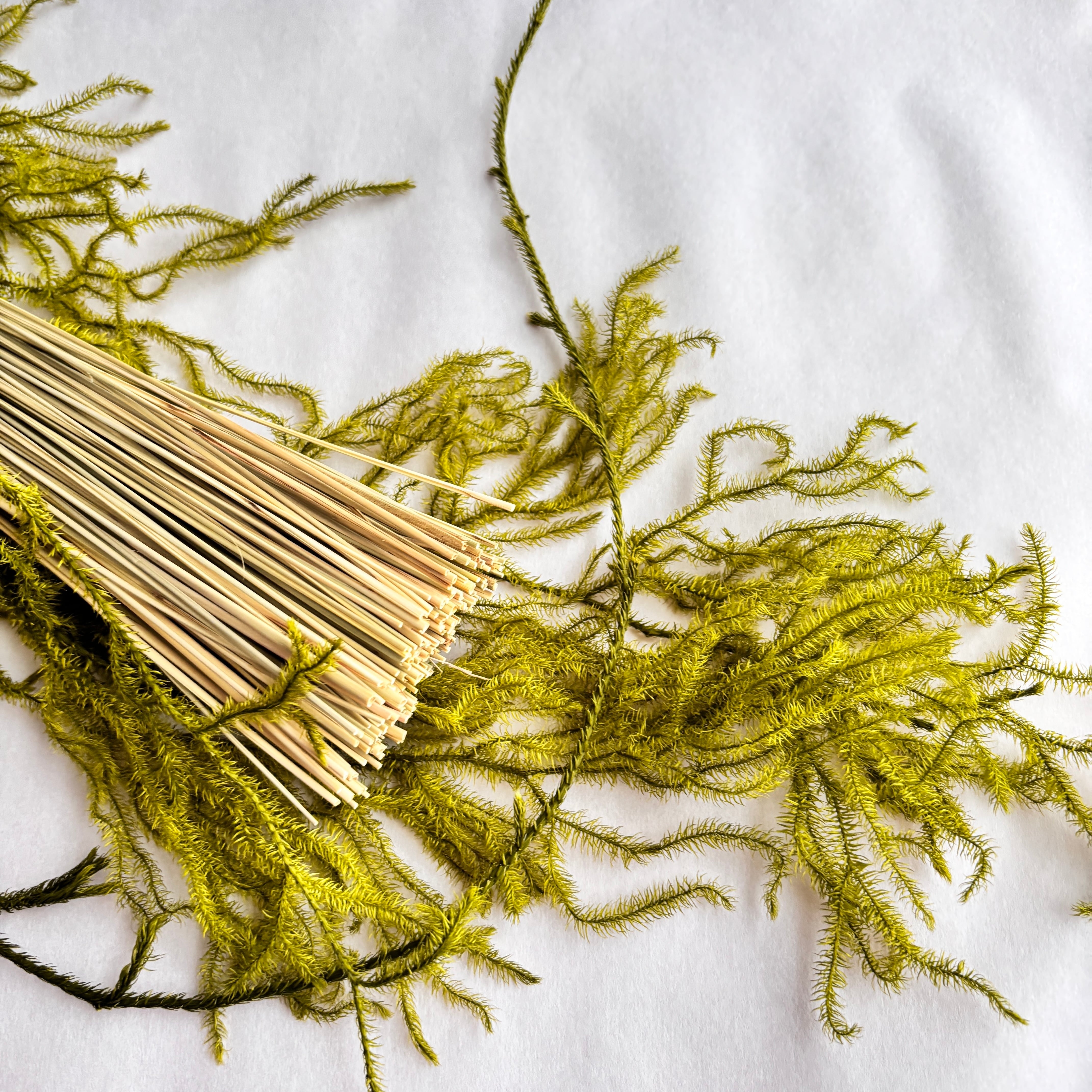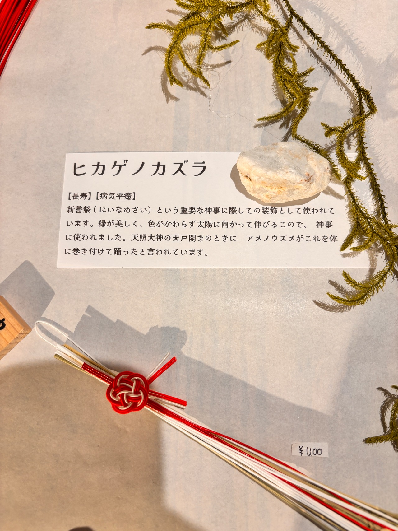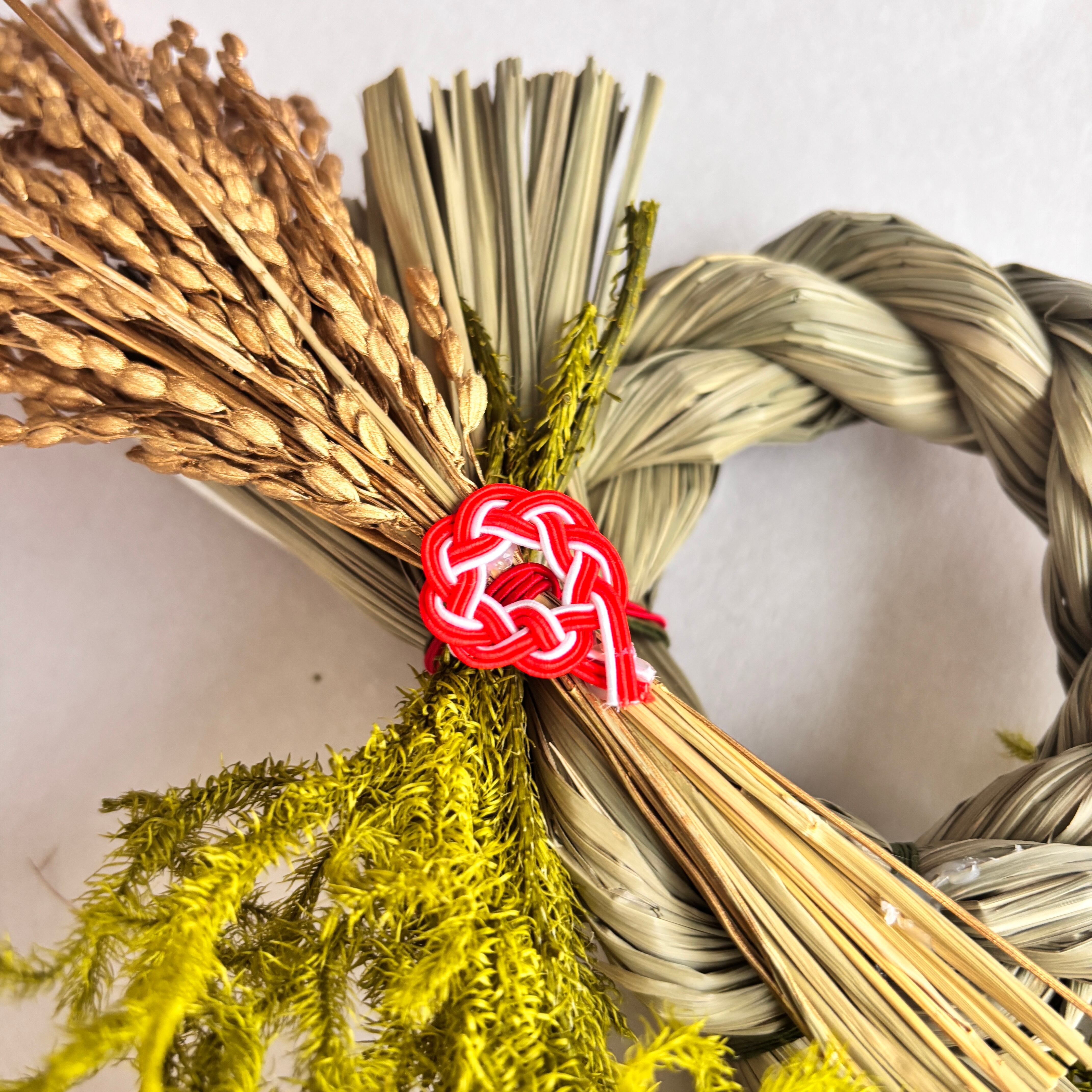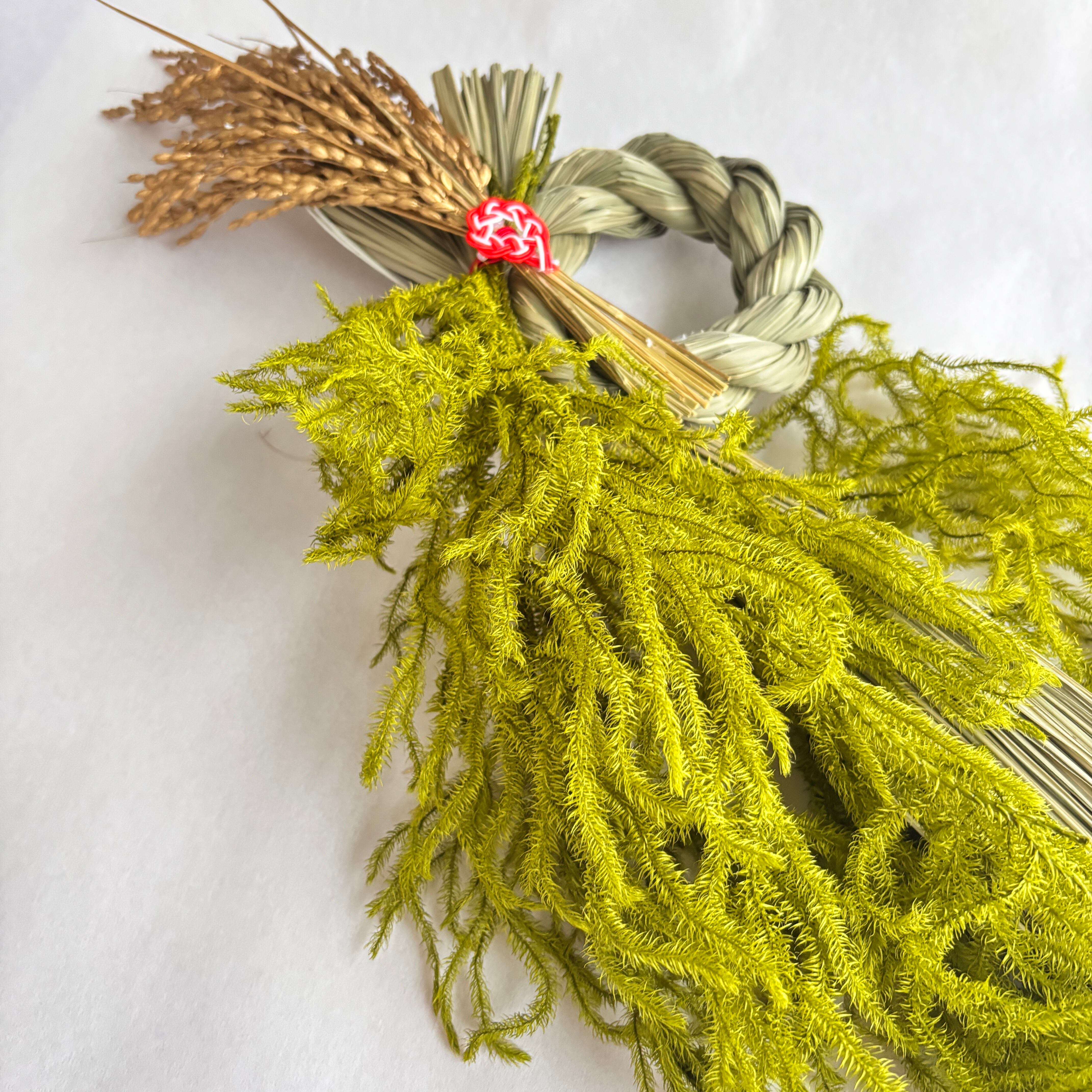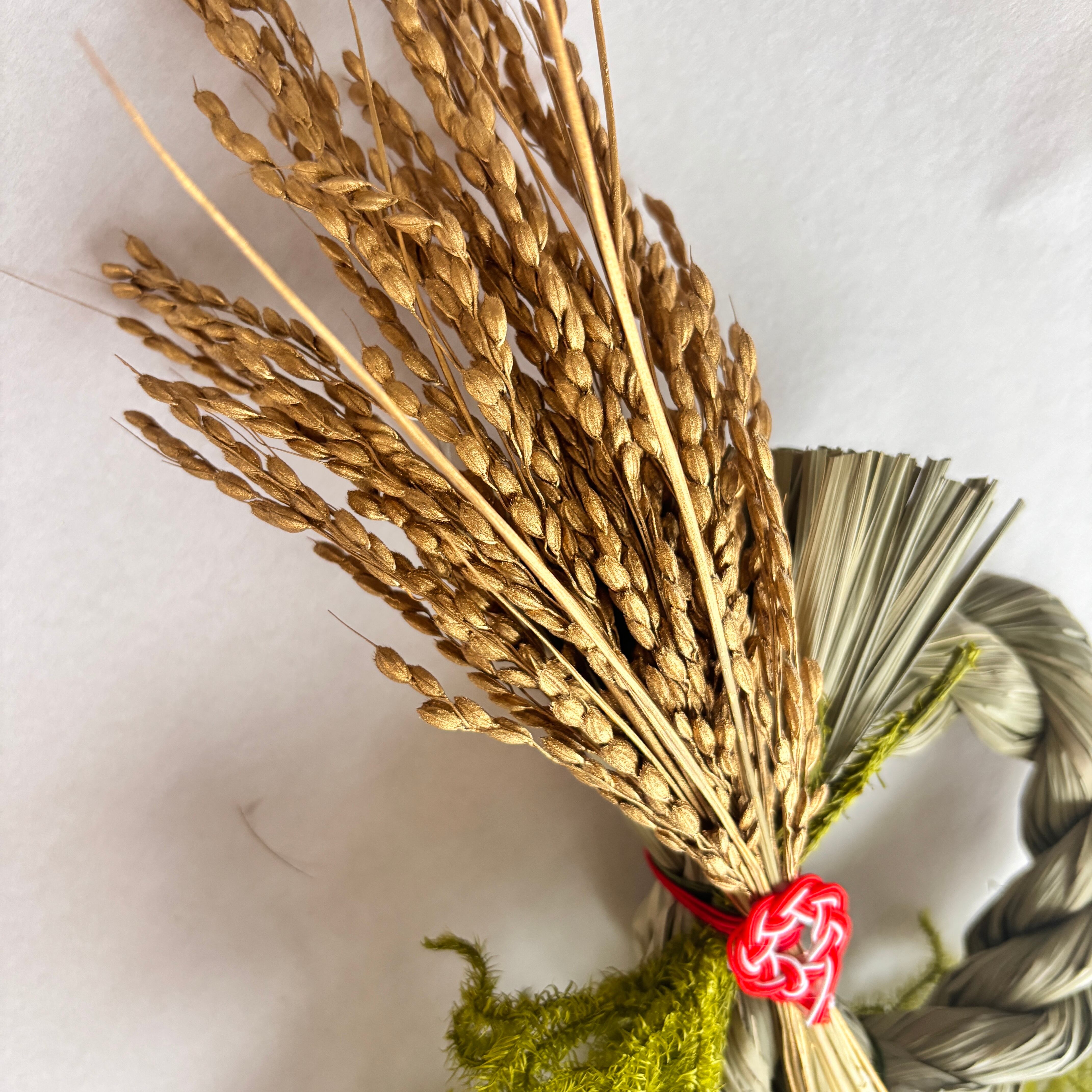 雪の下でも青々と伸びゆくことから健康・長寿・繁栄の象徴とされる《ヒカゲノカズラ》を贅沢に使い、豊の象徴とされる《稲穂》を共に生きる・循環するという意味の《あいおい結び》でまとめました。